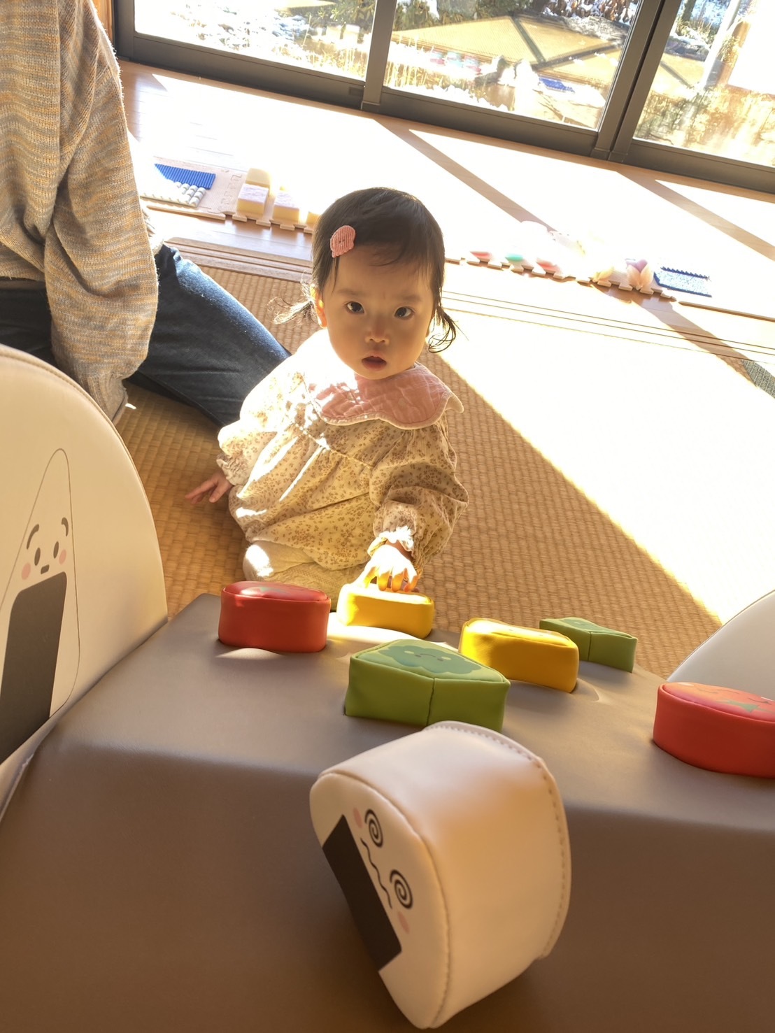わらべうたの先生が来て❝おせんべやけたかな❞などを親子で一緒に楽しみました。