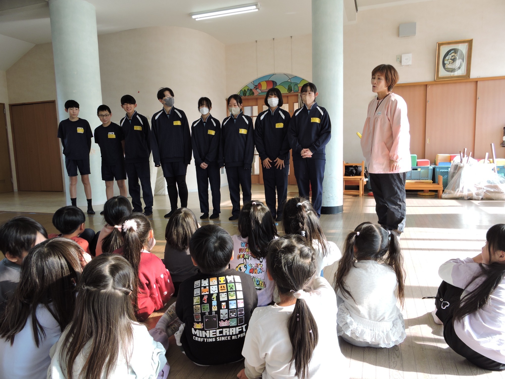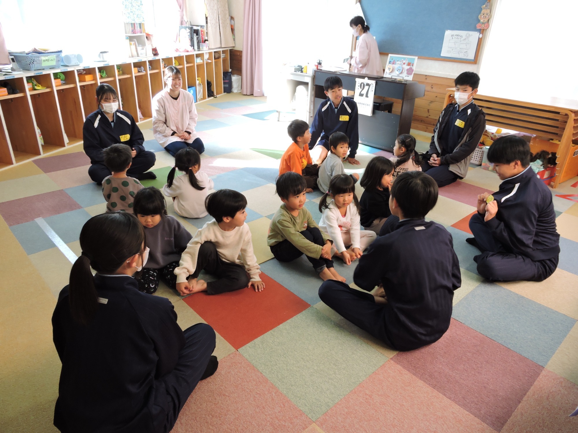 毎年三陽中学の2年生が家庭科の授業の一環で、園訪問してくれます。今年は2~3人のグループにわかれてお兄さんお姉さんから読み聞かせをしてもらいました。卒園児の子も来てくれて、大きくなった姿を見ることができるのも職員は楽しみにしています。