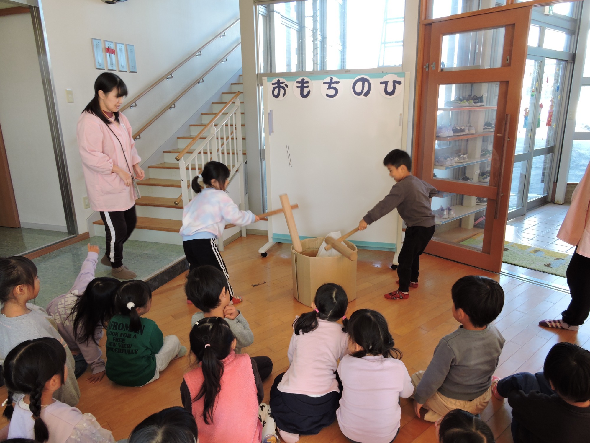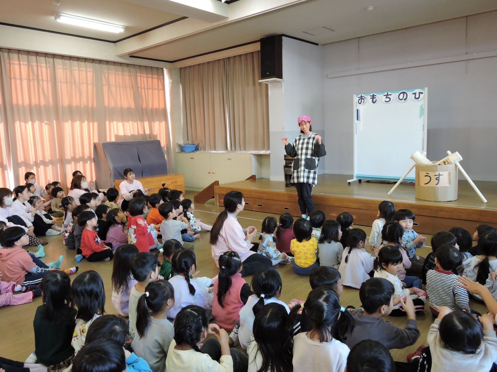 年長さんのはじめのことばで始まったもちつき会。も~ちつ~き ぺったんこ♪と「もちつき」の歌をみんなで歌い、もちつきってどうやってやるの?どんな道具を使うの?を教わりました。