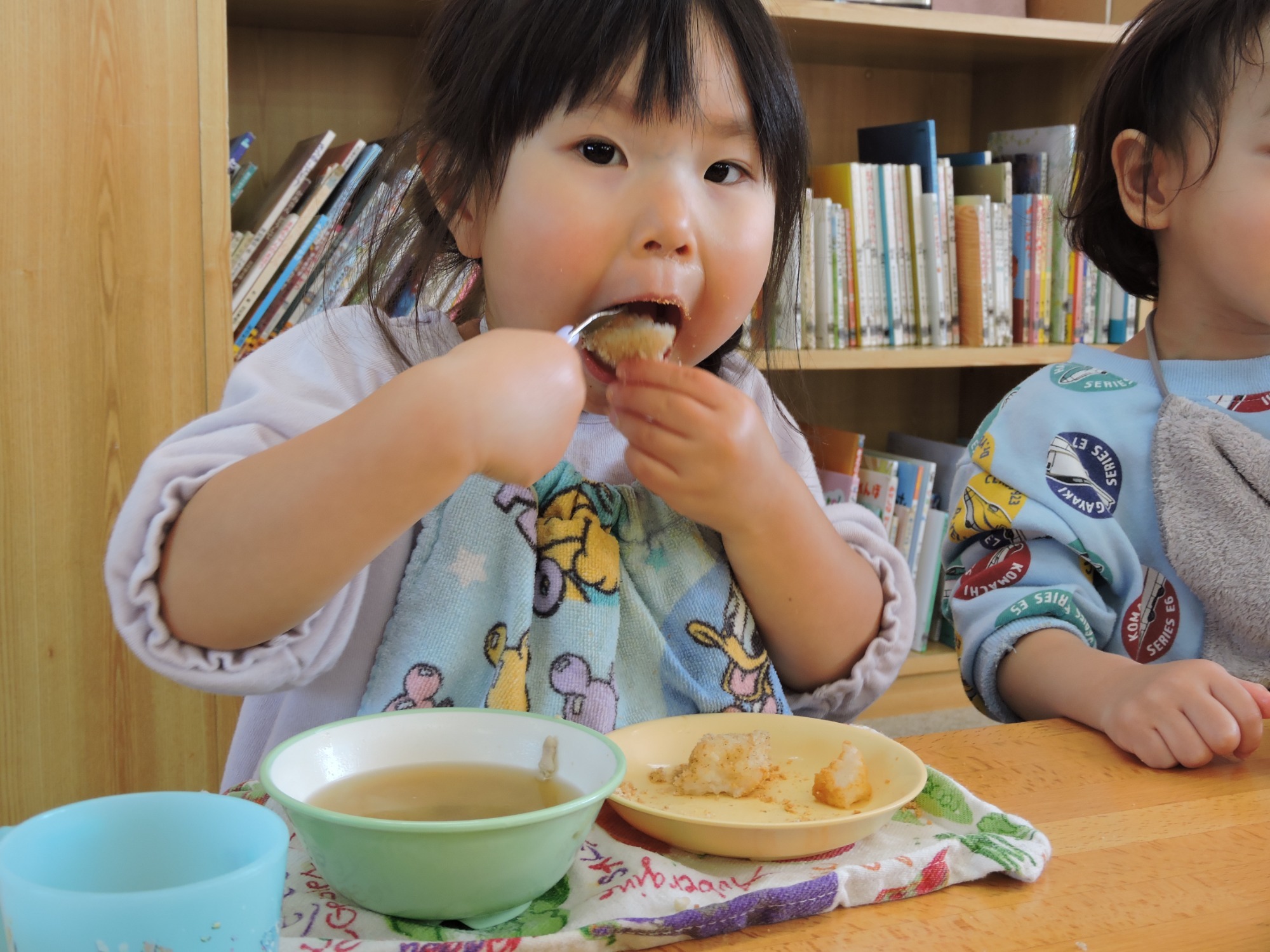 「かみかみもぐもぐしてよく噛んで食べると口の中でドロドロになります。慌てて一気に入れるのではなく適量をよく噛んで正しい姿勢で食べることが大事だよ。」と教わりました。