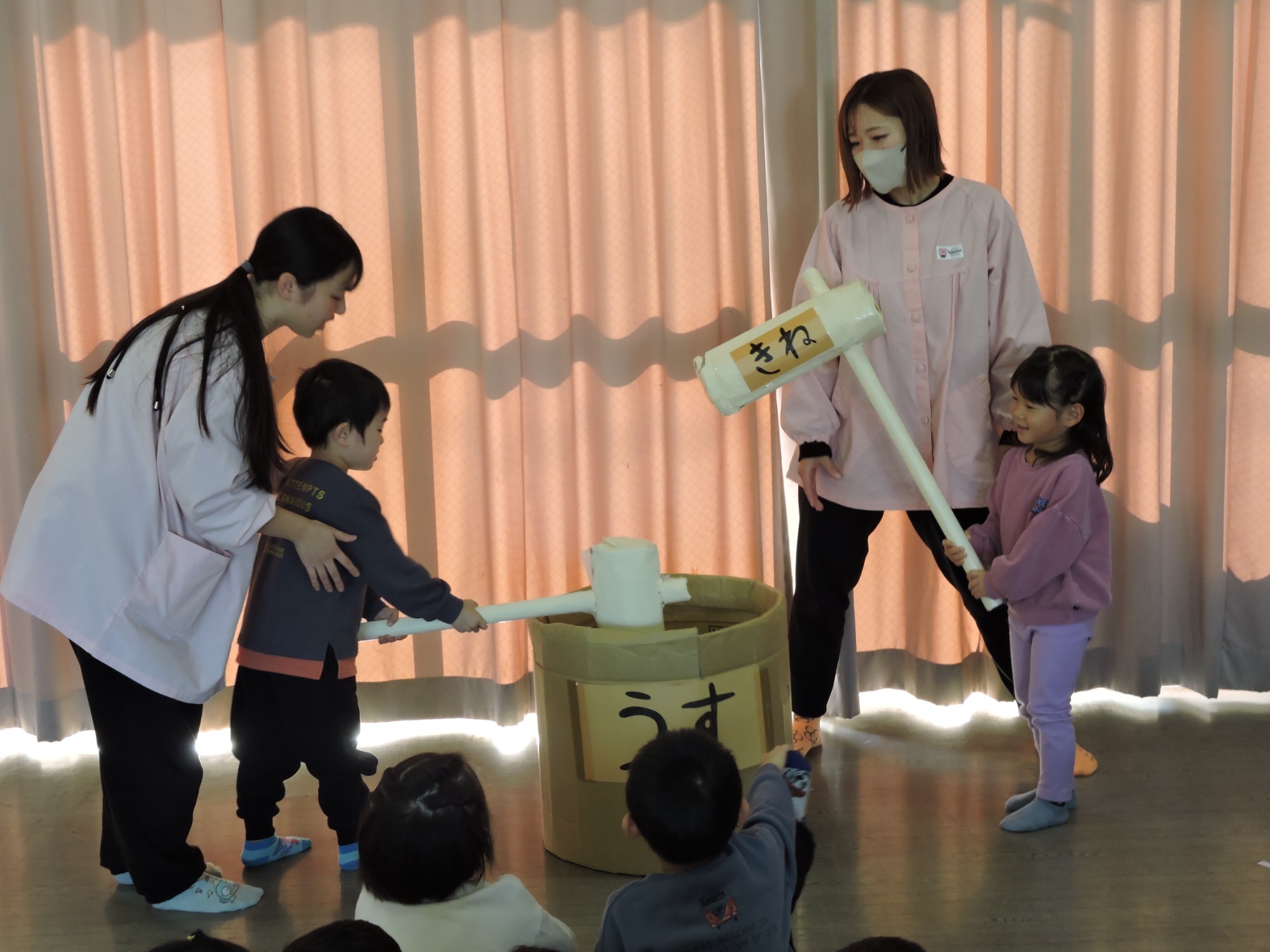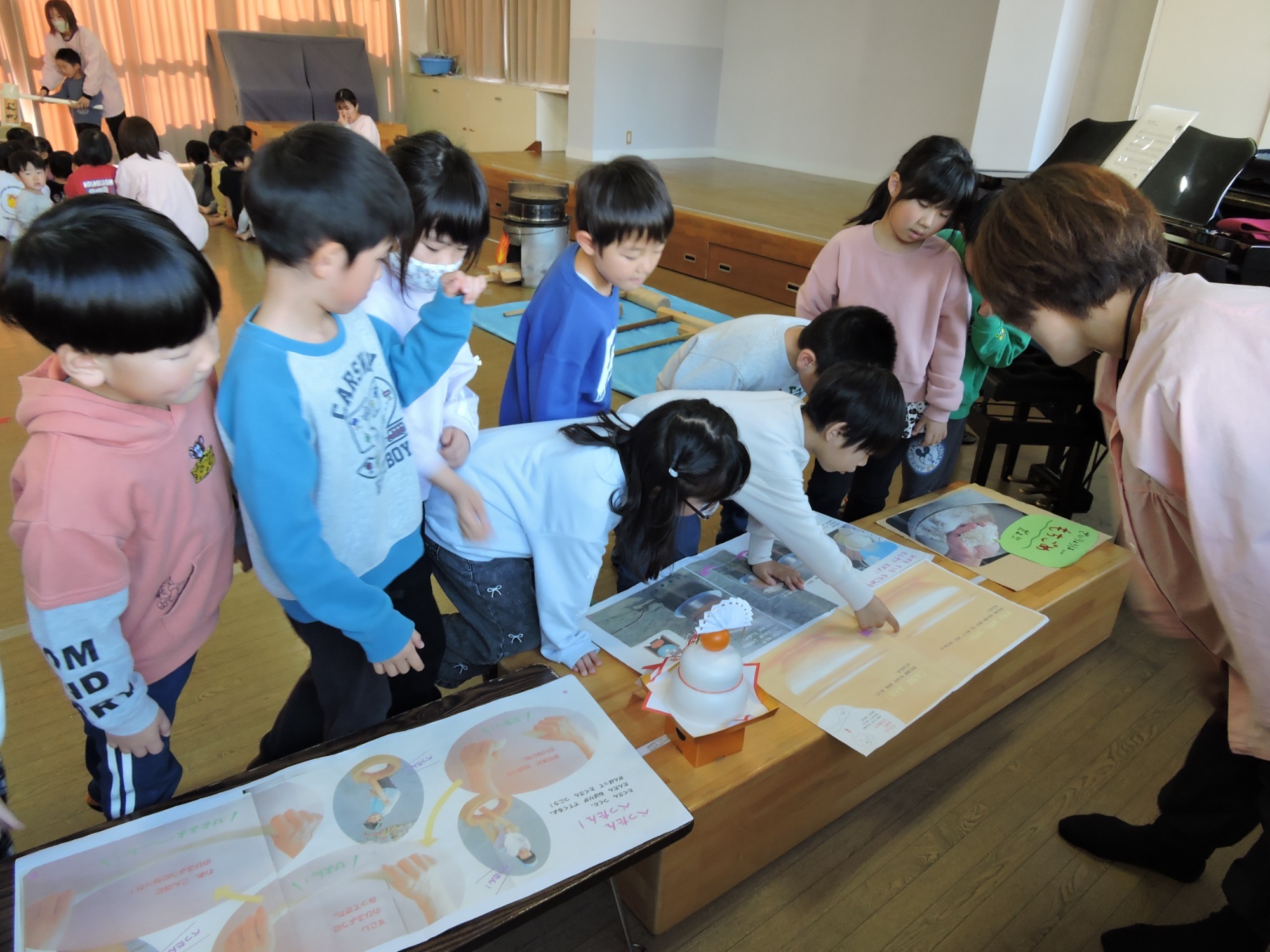 そのあと絵本コーナー、クイズコーナー、もちつきコーナーに分かれてそれぞれ学んだり実演体験をしました。