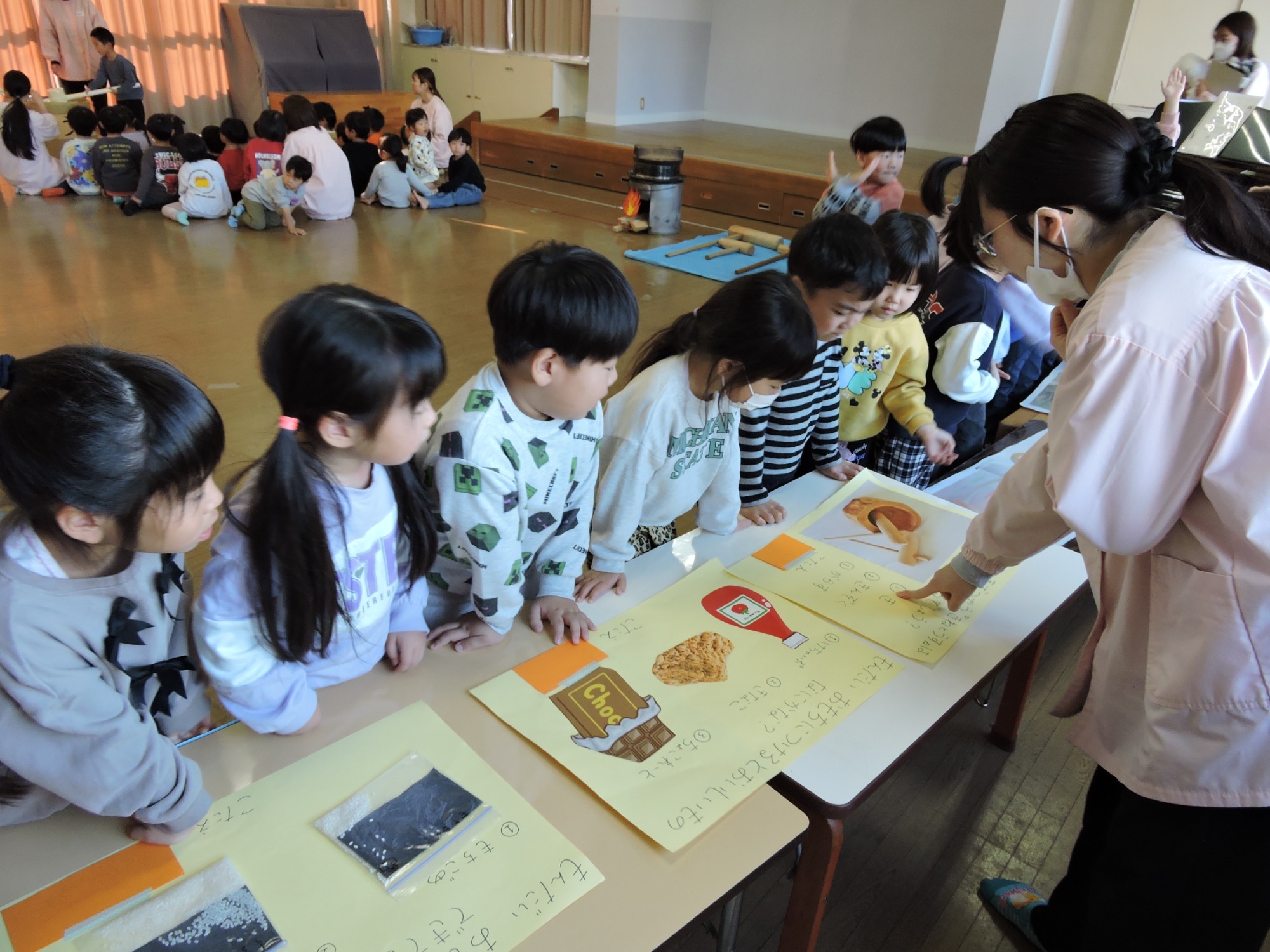 係の先生のペープサートの出し物…曲に合わせながら、いろんな野菜やくだものの帽子をとりかえっこ👒みんな大笑いだったね!