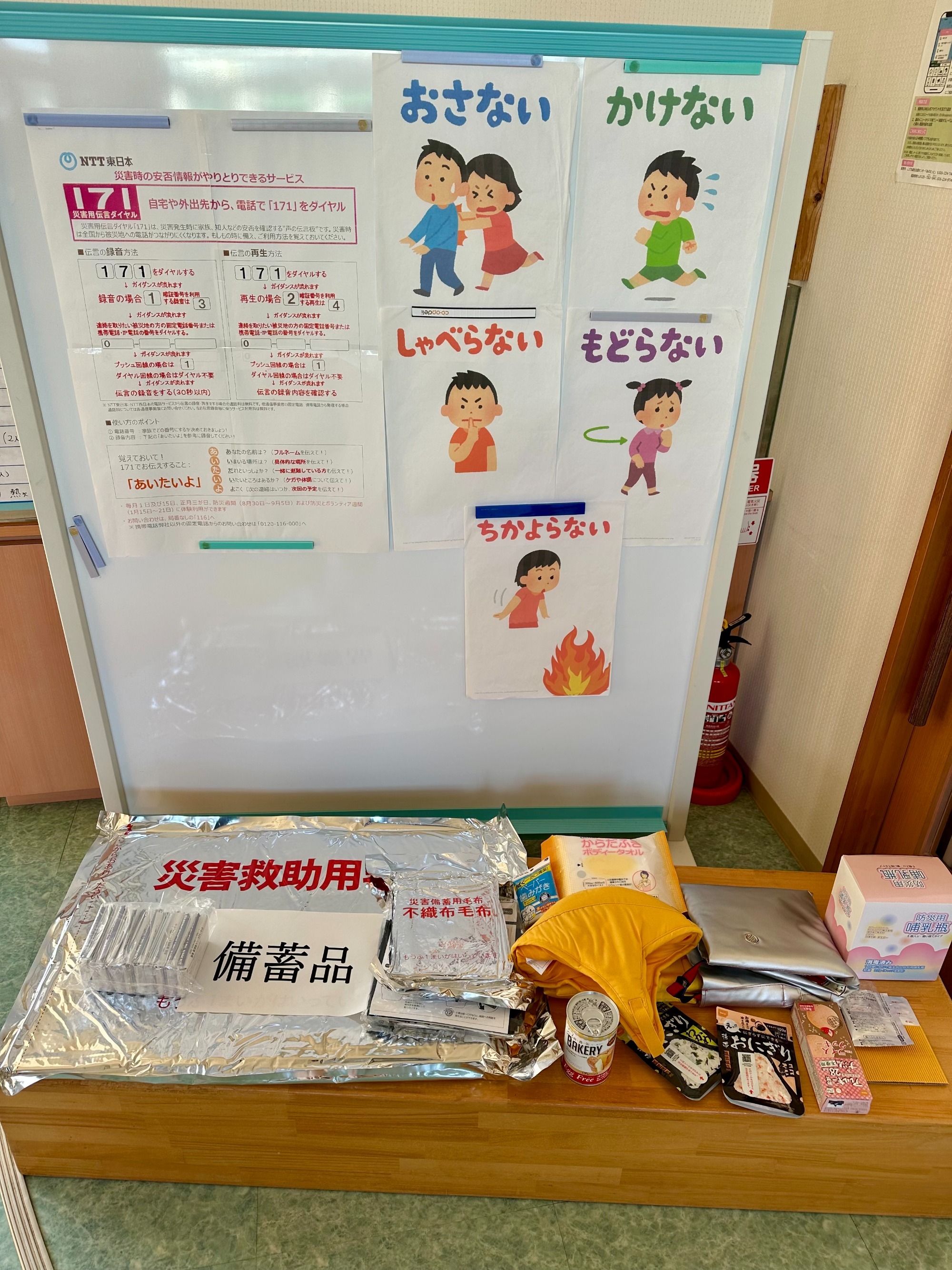 117ダイヤルの使い方・日頃園で行っている防災訓練について・園で備えている防災食の紹介をし、災害時に不安な子ども達を安心させるのは保護者がお迎えに来てくれる事という事を改めて確認しました。