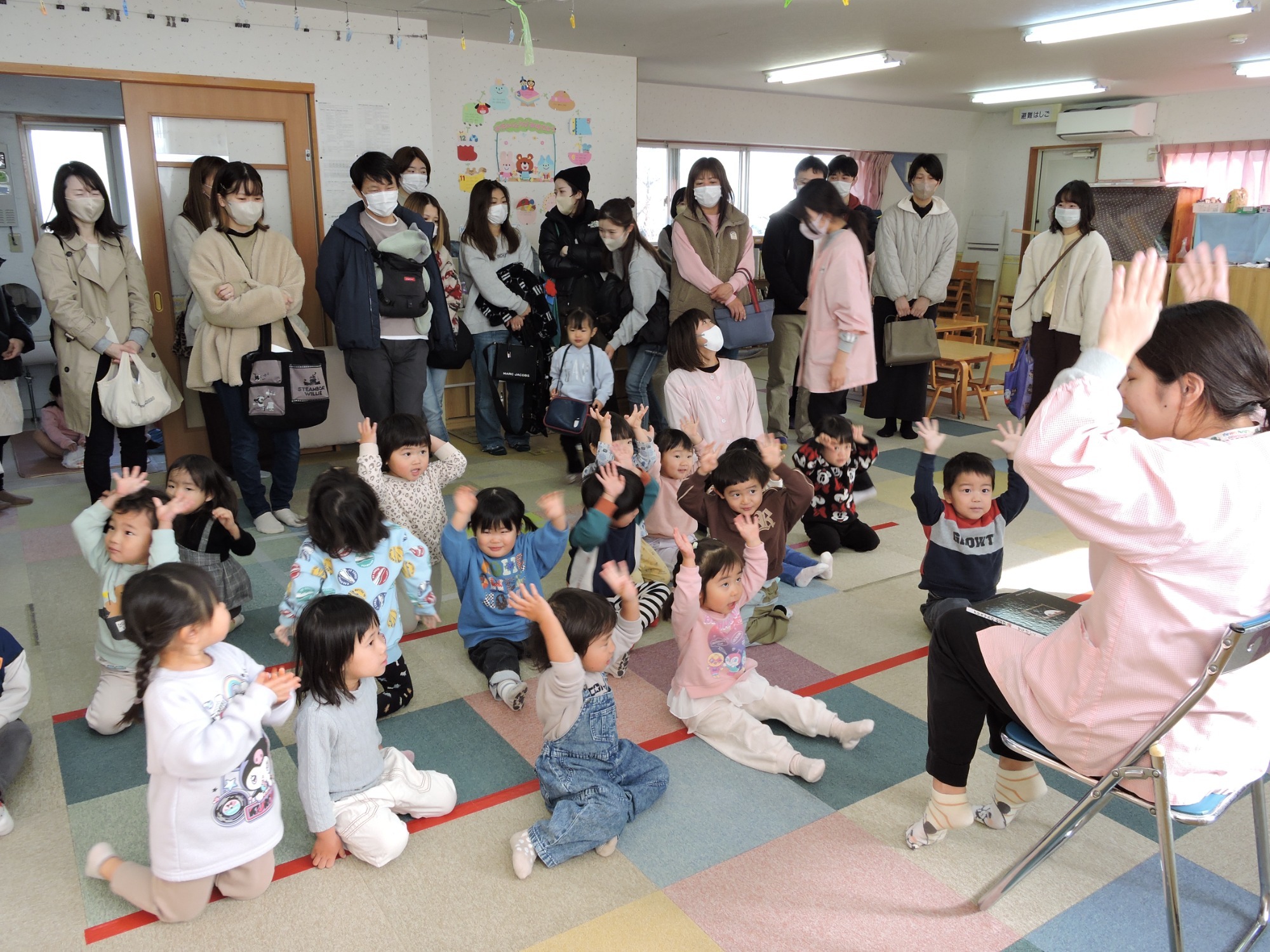 その後は伴奏に合わせて、子ども達もいっしょに体を動かしながら手拍子したり歌ったりと、子ども達もノリノリでしたよ♪