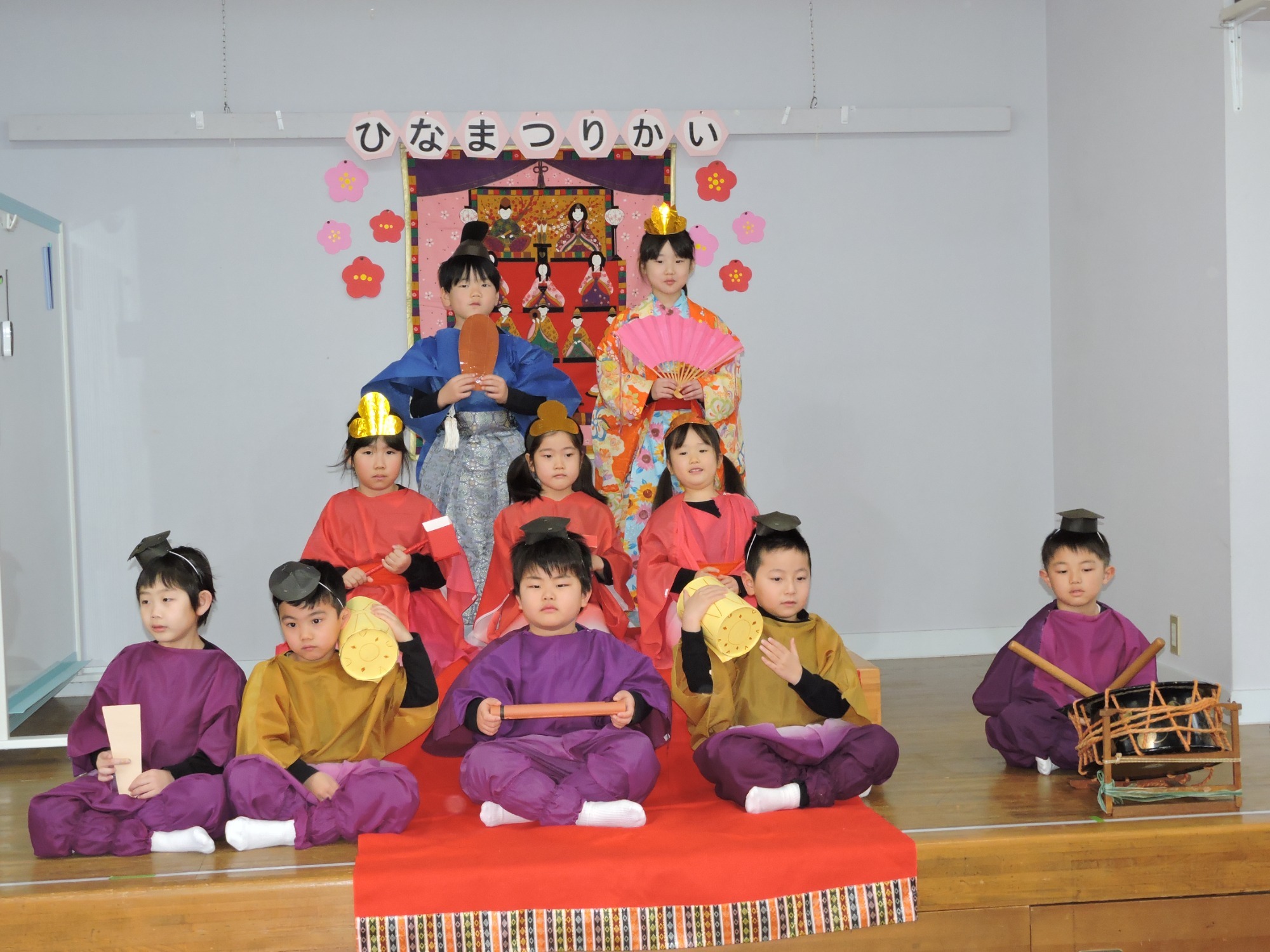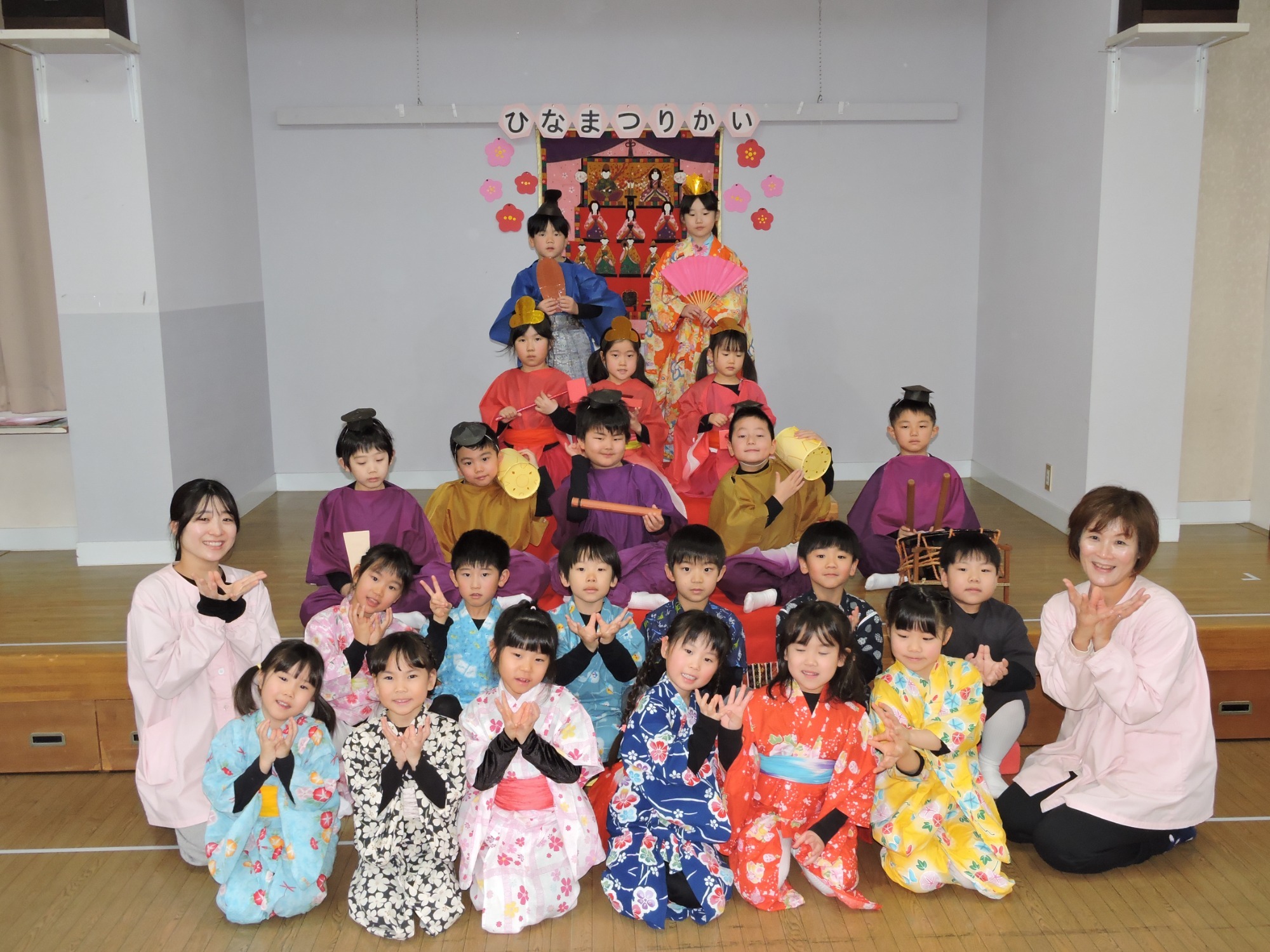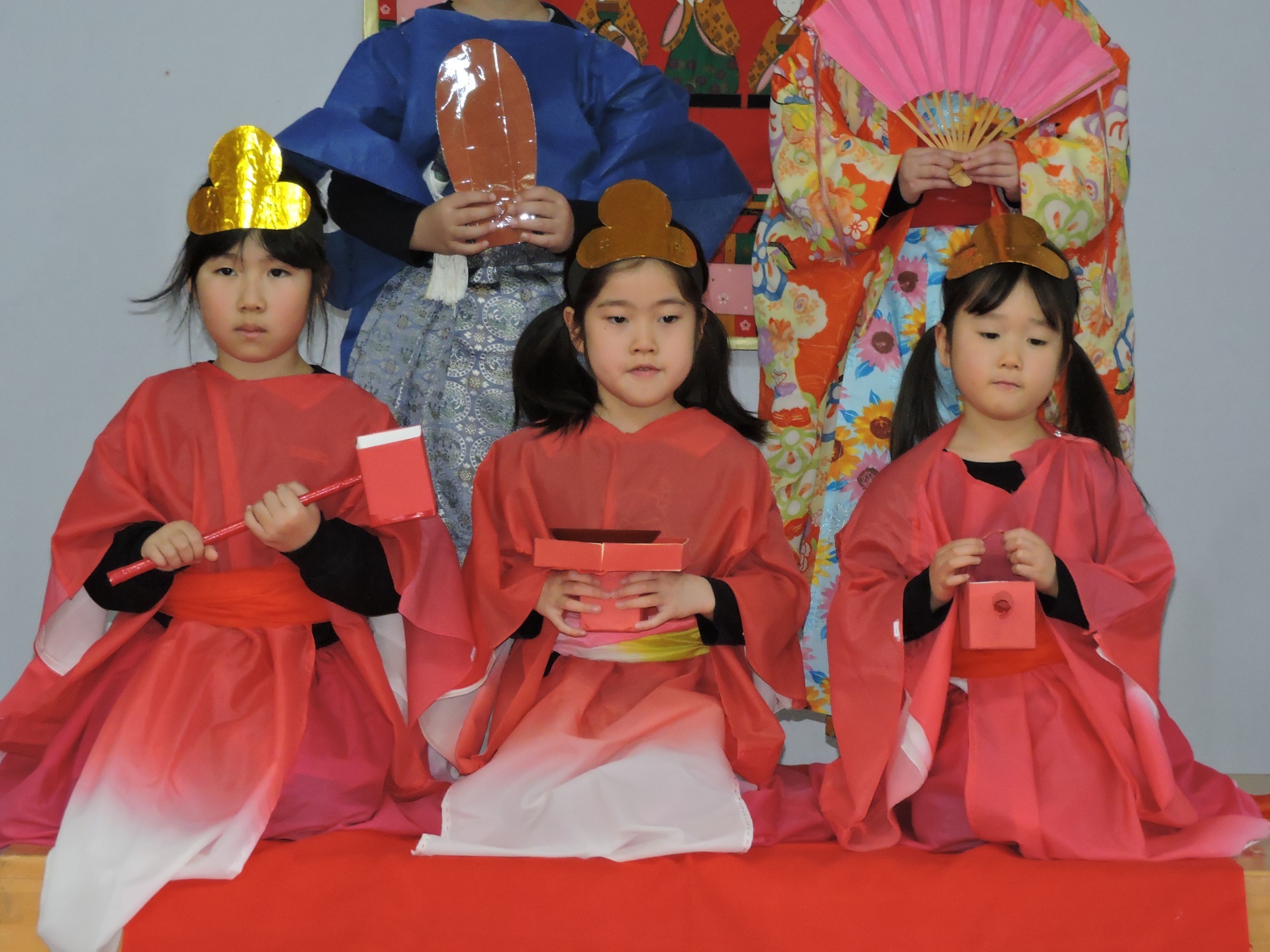 毎年年長さんたちが、お内裏様とお雛様・三人官女、五人囃子になって人間雛壇を作ります。