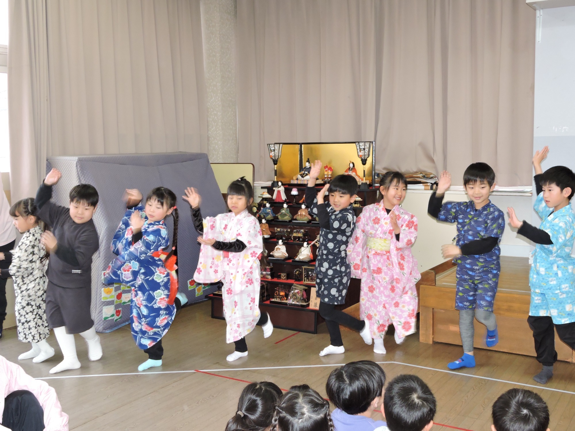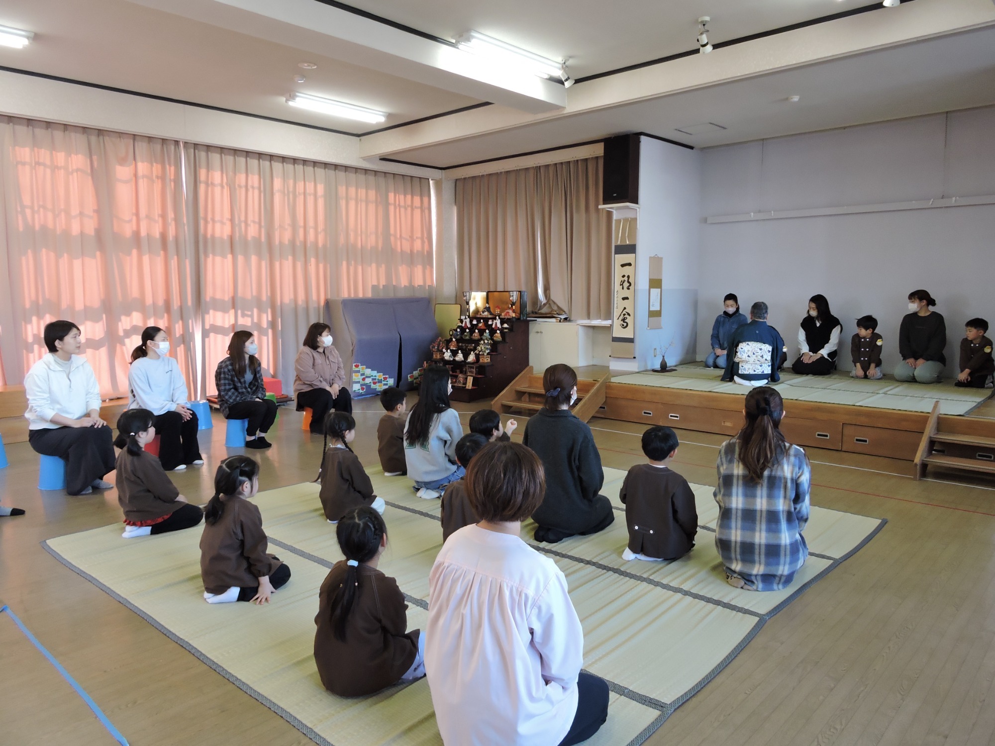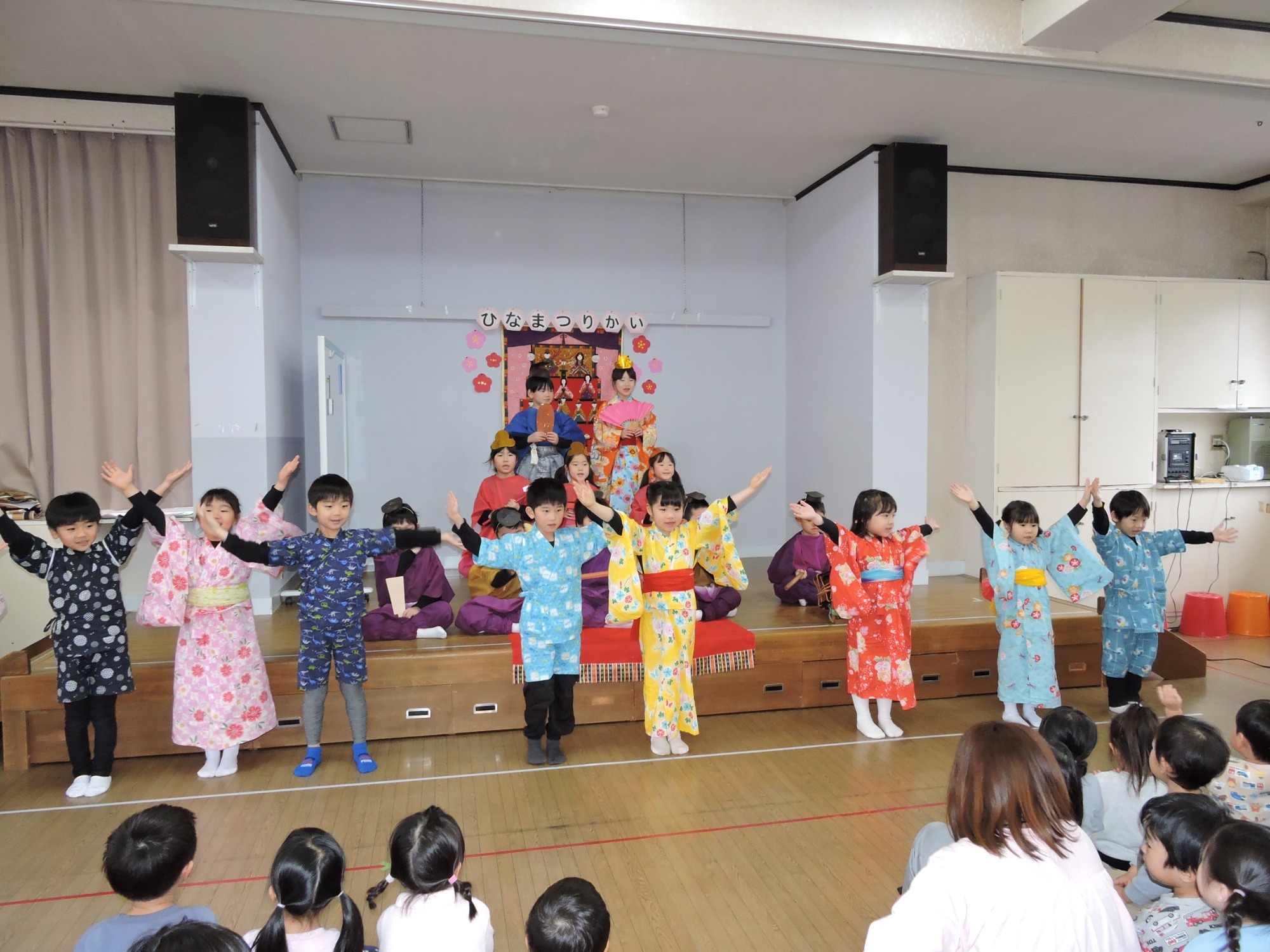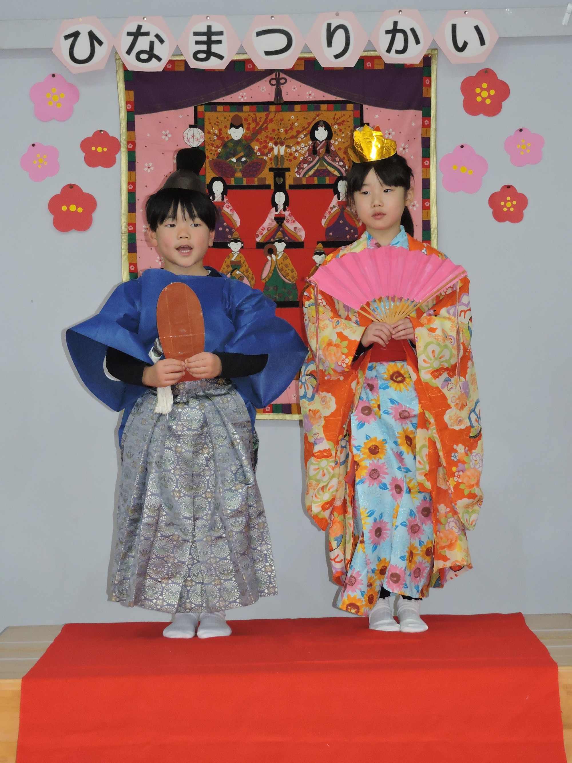 毎年年長さんたちが、お内裏様とお雛様・三人官女、五人囃子になって人間雛壇を作ります。