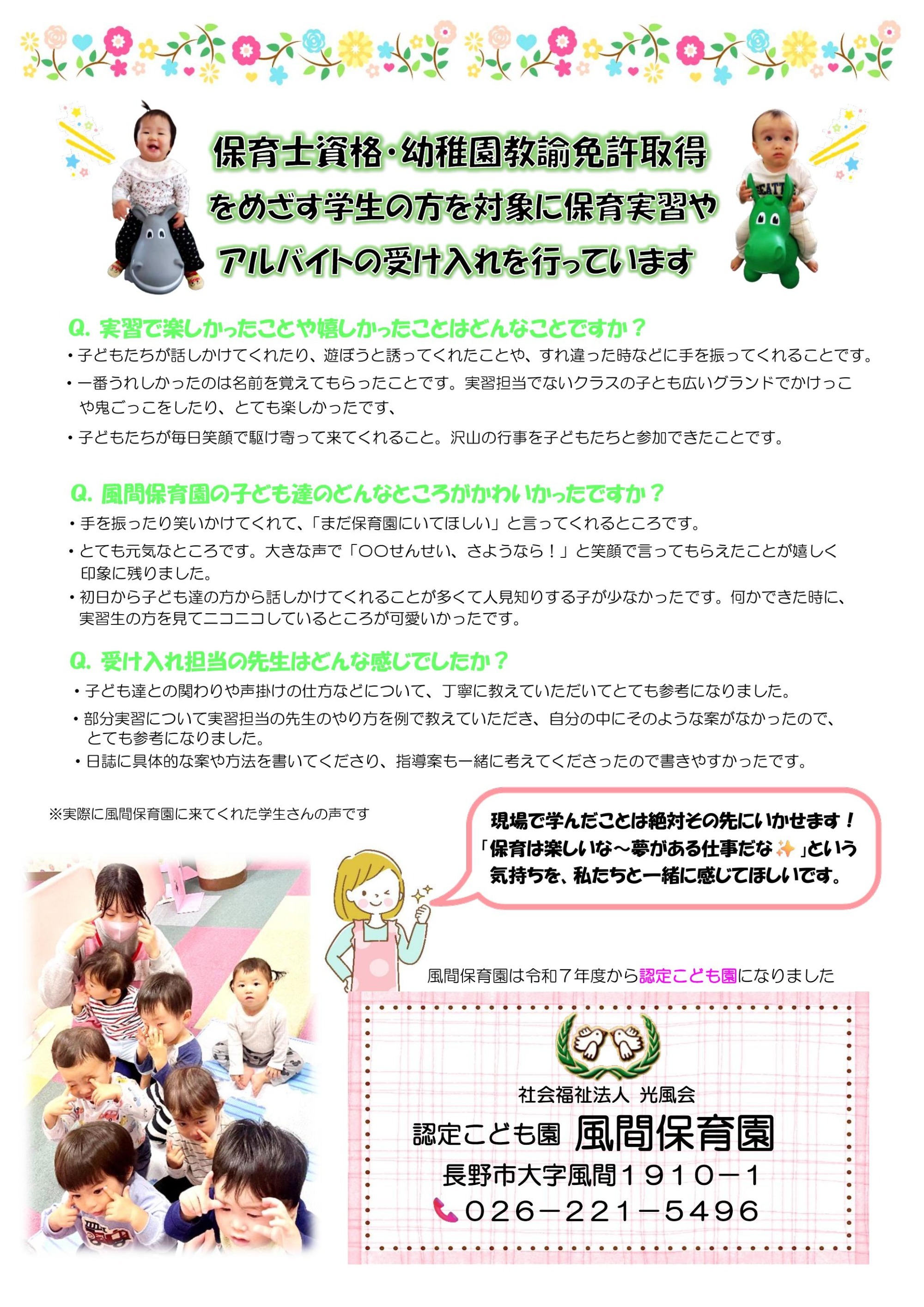 | 募集対象 | ~本園で実習や頑張り次第で就職も~ 将来『せんせい』を目指している方にぴったりなお仕事です♪ 先輩の保育士と一緒に子ども達と関わる中で学ぶことも多いはず! 学生時間を有意義に過ごすだけでなく当園の仲間になっていただくことで、時間をかけて風間保育園について知ることができます! |
