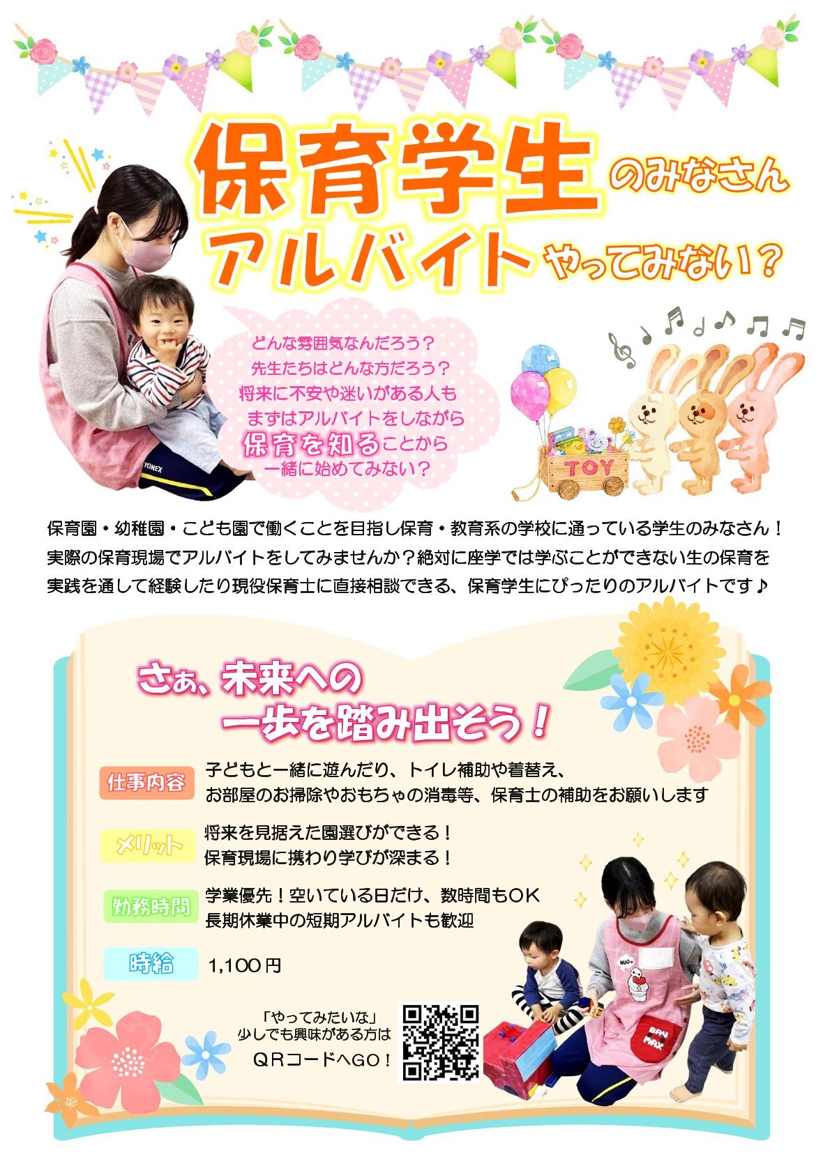 | お仕事内容 | ~将来の夢に近づくための第一歩~ 延長保育時間やお昼寝時間に、クラスの保育士や子どもたちのサポートをお願いします 子どもと一緒に遊んだり、トイレ補助や着替え、寝かしつけの他、お部屋のお掃除やおもちゃの消毒などのお手伝いをお願いします |